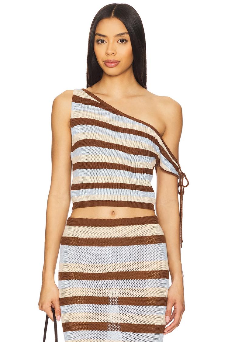 Soft lightweight knit in matte light blue and brown stripes combines with a slim cropped silhouette and asymmetric neckline for a modern, casual chic look. The one-shoulder design features a sleeveless cut with a brown tie bow accent on the strap, adding subtle charm. This semi-sheer Hazel Top crafted from breathable cotton and acrylic blend offers versatility for casual days, brunch outings, or night events. Its pullover style and fitted shape ensure easy wear and flattering appeal in warmer spring and summer seasons.