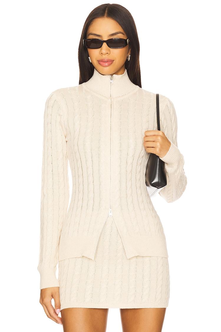 A timeless cream cable-knit shell with a fitted silhouette and mock neck that offers cozy elegance for autumn and winter days. The invisible front zipper closure adds sleek functionality while maintaining a clean line, complemented by long regular sleeves and hip-length cut. Crafted from a soft blend of cotton and acrylic, this classic minimalist top is perfect for casual outings, workwear, business casual settings, and brunch. Its refined texture and versatile design bring understated sophistication to your seasonal wardrobe.