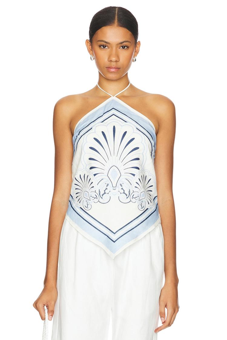 Soft linen and cotton blend fabric bring breathable comfort to this hip-length camisole, featuring an abstract blue print on white for a fresh bohemian vibe. The halter neck with tie-back closure and hidden side zipper ensure a secure fit, while the sleeveless, strapless styling enhances its airy appeal. Perfect for spring and summer outings, this regular fit top pairs effortlessly for casual days, vacation getaways, or brunch dates. Its poplin texture and relaxed silhouette make it a versatile and chic addition to your warm-weather wardrobe.