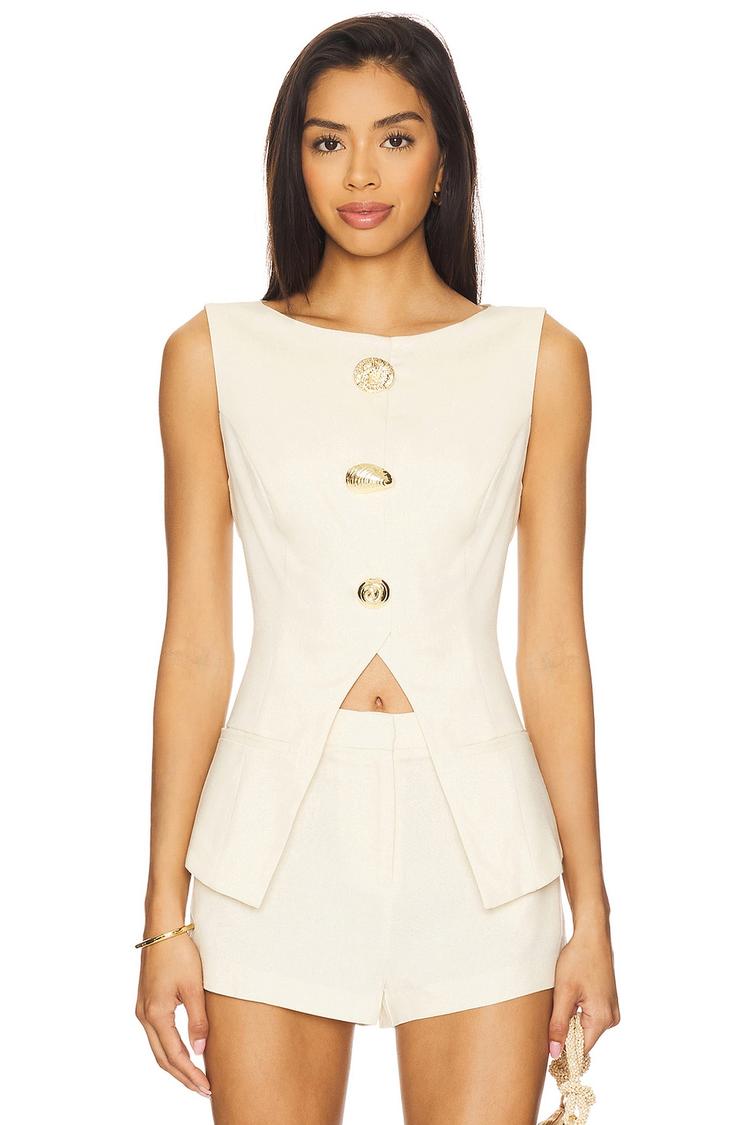 Clean lines and a tailored fit define this off-white shell top crafted from a midweight linen-viscose blend with a soft cotton lining. The sleeveless, round neckline silhouette features hip-length cut with a sleek concealed side zipper and elegant gold-tone seashell appliqué accents on the front. Minimalist and sophisticated, this top pairs effortlessly with tailored bottoms for workwear, brunch dates, or casual business events, embracing a modern chic aesthetic suitable for spring and summer seasons.
