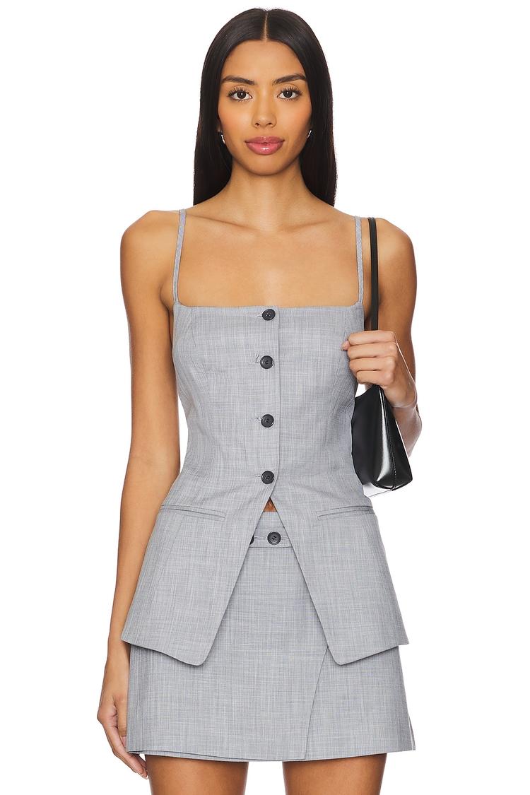 Structured with a midweight twill fabric, this tailored camisole features a square neckline and slender spaghetti straps with an adjustable back tie for a perfect fit. The fitted silhouette and front button closure add a refined touch to its classic gray hue, making it an ideal piece for casual outings, business casual settings, or brunch dates. Versatile and polished, this hip-length top pairs effortlessly with skirts or trousers for a minimalist yet sophisticated look throughout spring, summer, and autumn.