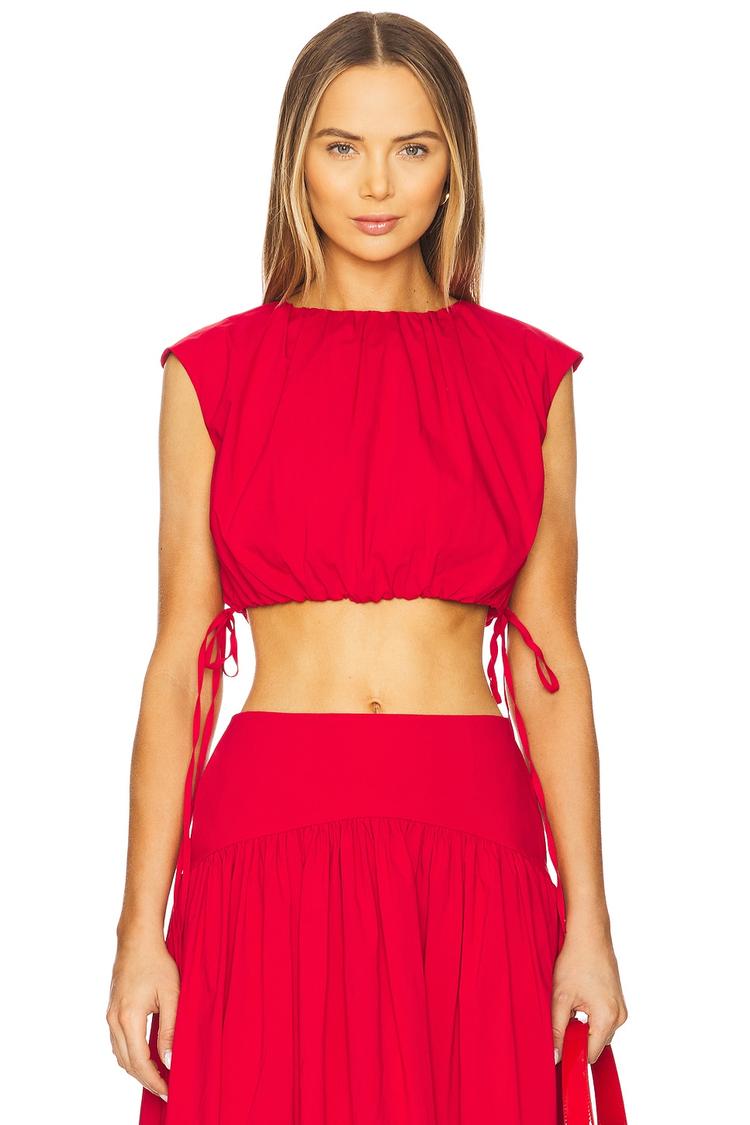 Bright red cotton poplin brings vibrant energy to this cropped top featuring a relaxed fit and sleeveless wide straps. The round neckline and elastic hem with side ties create a flattering silhouette that pairs perfectly with high-waisted skirts or pants. Ideal for spring and summer outings, this modern casual chic piece suits brunches, vacations, and laid-back days. The back button loop closure adds subtle detail while maintaining comfort and ease of wear.