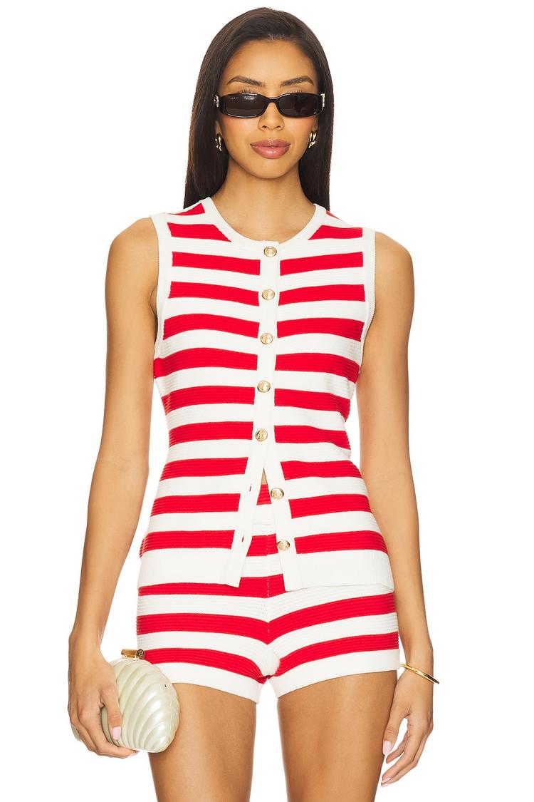 Bold red and white stripes define this fitted sleeveless Devin Tank with a classic crew neck and wide straps. Crafted from a midweight cotton-acrylic-nylon knit, it features a front button closure that adds subtle charm and versatility. Its hip-length silhouette makes it ideal for casual outings, brunches, and vacation days, blending modern style with comfortable wearability. Perfect for spring and summer, this tank offers a fresh, casual chic look that easily pairs with shorts or jeans for everyday ease.