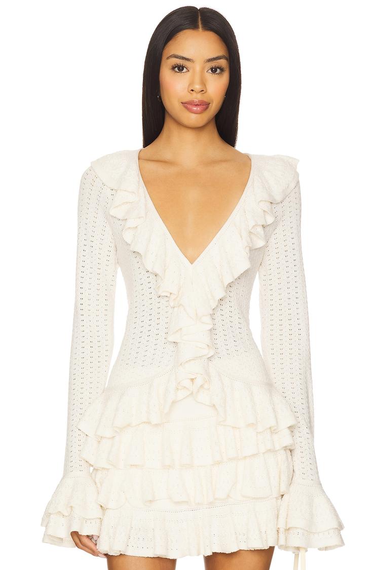 Soft off-white knit and delicate perforated texture define this thigh-length smock top, featuring a plunging neckline framed by romantic ruffles. The fitted silhouette accentuates the waist, while long sleeves end in subtle ruffle trims, enhancing its elegant charm. Perfect for casual brunches, date nights, or evening outings, this pullover knit top combines timeless sophistication with a chic, feminine vibe.