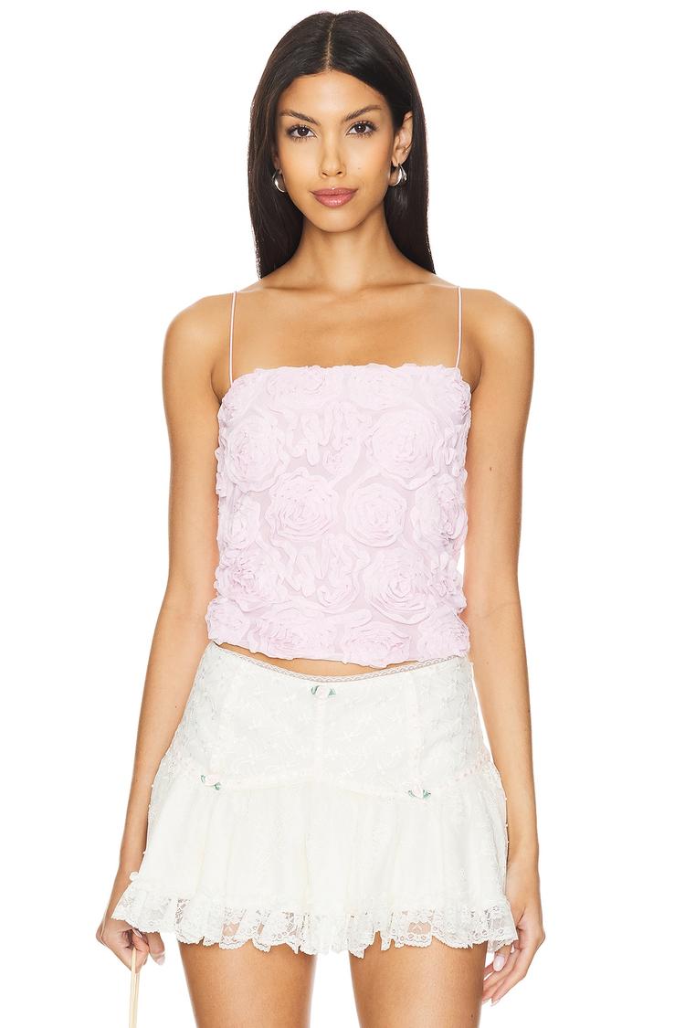Delicate floral appliqué adorns this fitted camisole in a soft light pink hue, crafted from lightweight mesh fabric with a touch of spandex for stretch. Featuring a straight neckline and slender spaghetti straps, this waist-length top offers a flattering silhouette perfect for warm spring and summer days. Its romantic and chic vibe suits casual outings, brunch dates, or a charming date night look. The covered back and slip-on design ensure easy wearability, making it a versatile piece for your seasonal wardrobe.