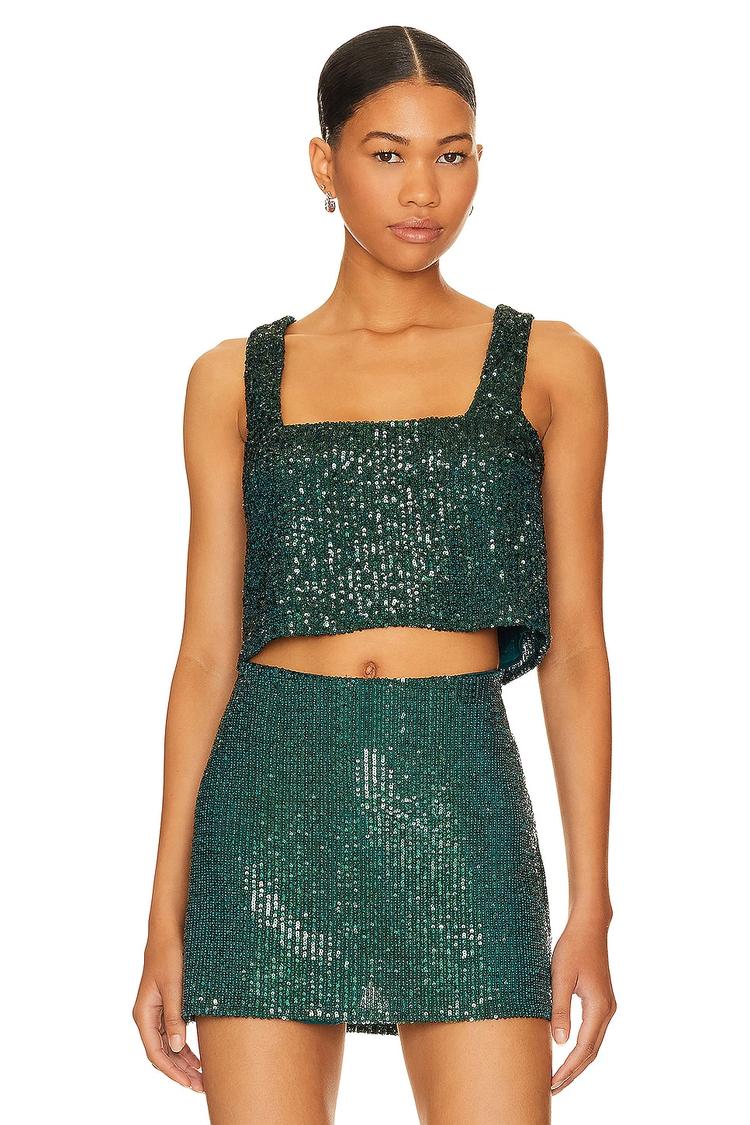 Shimmering in deep green sequins, this cropped top features a square neckline and wide straps for a flattering sleeveless silhouette. Crafted from a smooth polyester satin blend, it offers a regular fit that pairs perfectly with high-waisted skirts or pants. Ideal for spring and summer nights, this piece effortlessly elevates your look for girls' nights, parties, and night outs with its chic and trendy appeal.