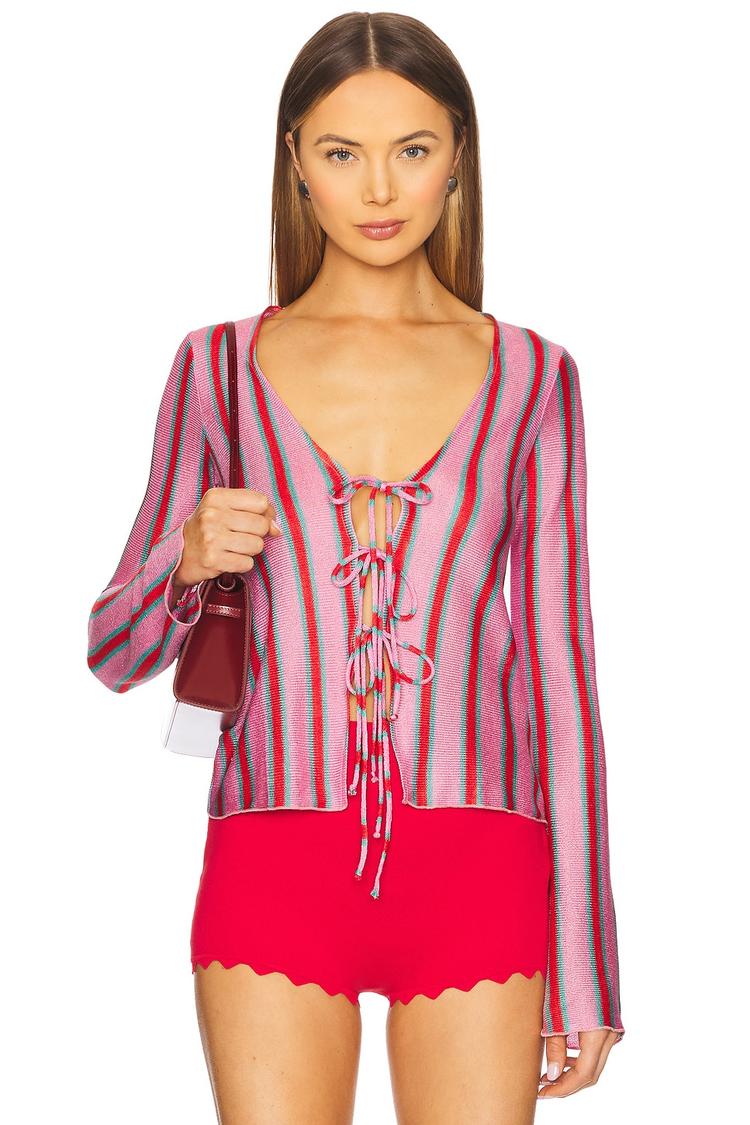 Lightweight knit fabric and a semi-sheer finish define this cropped tie-up top in dusty rose and burgundy stripes. The long sleeves and regular fit balance a flattering waist-length hem, while the V-neckline with triple front ties adds a bohemian charm. Perfect for casual days, brunches, and date nights, this polyester top offers a breezy feel and effortless style that transitions well across spring, summer, and autumn seasons.