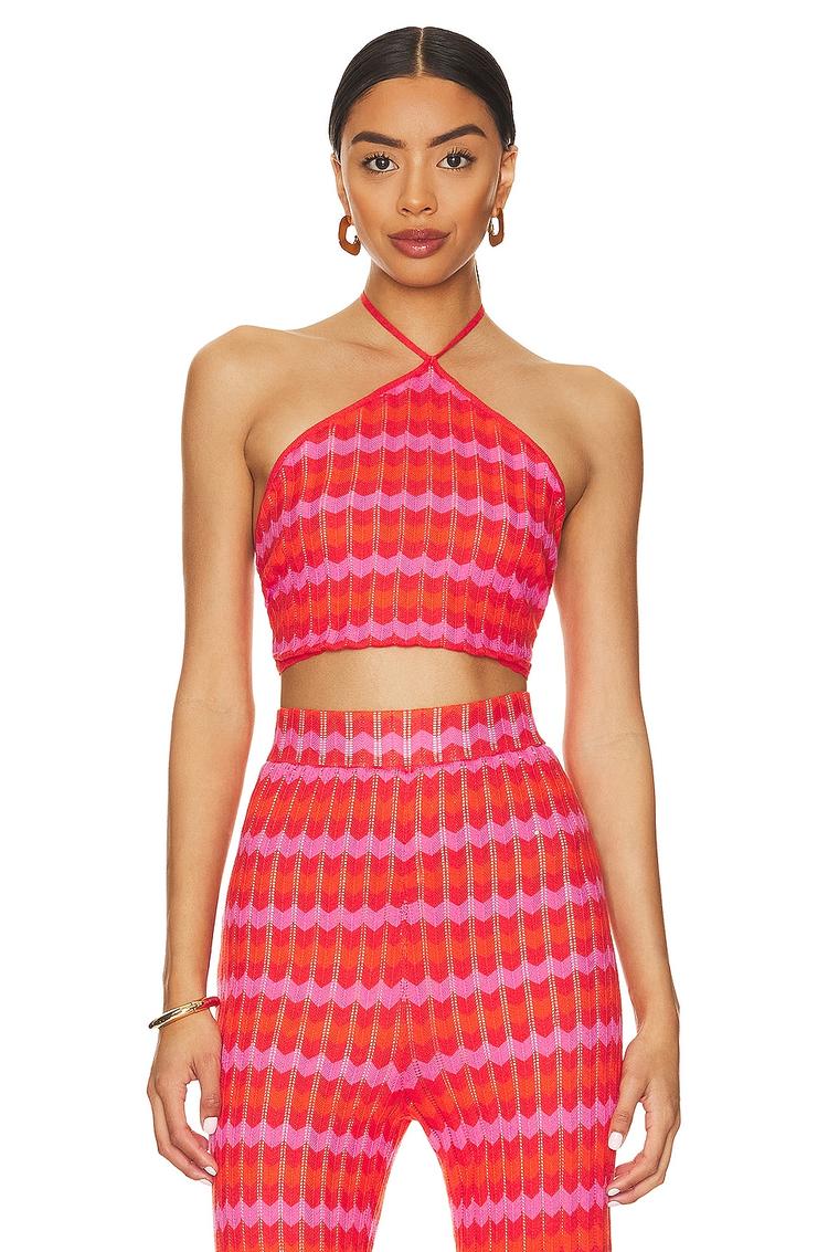 Vibrant hues and a fitted silhouette define this halterneck camisole, crafted from a soft cotton-viscose blend for breathable comfort. The cropped length and tie-back closure create a playful, flirty appeal, while the abstract all-over pattern adds a trendy boho vibe. Ideal for warm spring and summer days, this top pairs effortlessly with high-waisted bottoms for casual outings, beach vacations, or brunch dates. The strapless sleeve styling enhances its summery, relaxed charm, making it a versatile piece for streetwear and laid-back occasions.