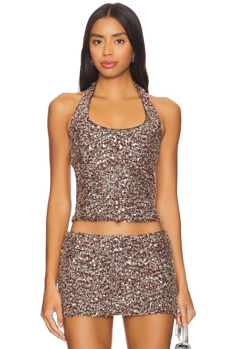 Shimmering with all-over sequin embellishments, this fitted cropped top features a flattering halter neck and strapless sleeve styling that perfectly complements its tie-back closure. Crafted from a lightweight blend of polyester, elastane, viscose, and satin, it offers a sexy and trendy silhouette ideal for summer nights out, parties, or girls' night events. The metallic bronze finish adds a captivating shine that elevates any evening look with effortless glamour and confidence.