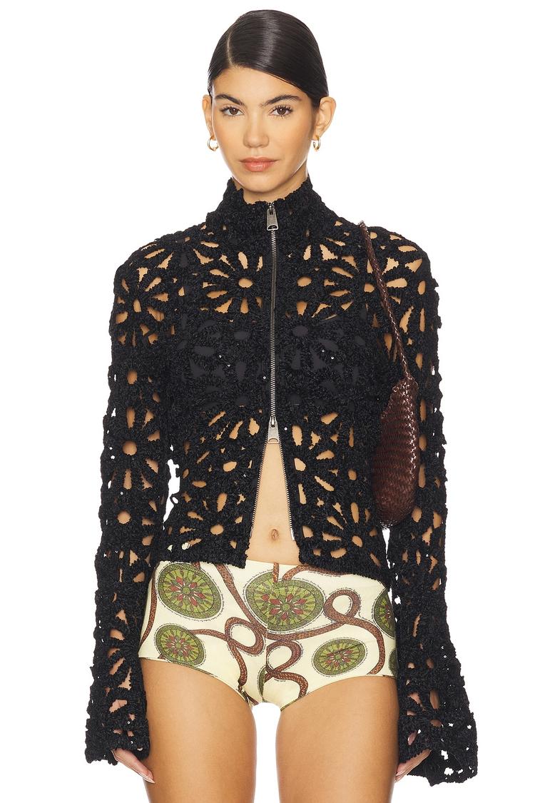 Intricate sheer black polyester shell with a high neck and flared long sleeves creates a striking silhouette. The slim fit and waist-length cut are complemented by a two-way zipper closure, adding versatility and ease of wear. The openwork design lends an edgy, trendy vibe perfect for casual outings, night events, and streetwear looks. This Jun Top blends daring style with modern detailing, making it a standout layering piece or statement top for all seasons.
