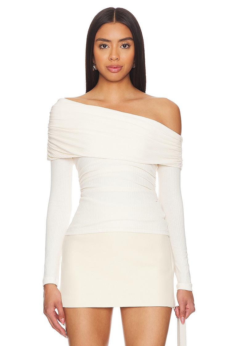 Softly structured with a foldover asymmetric neckline, this fitted cropped top in off-white lightweight ribbed jersey fabric offers a sleek silhouette. The long regular sleeves and subtle ruching detail along the bodice enhance its minimalist yet sophisticated appeal. Ideal for casual outings, brunches, or date nights, it pairs beautifully with skirts or high-waisted pants for a chic statement. Crafted with polyester and elastane, it ensures comfortable stretch and shape retention for all-weather wear.