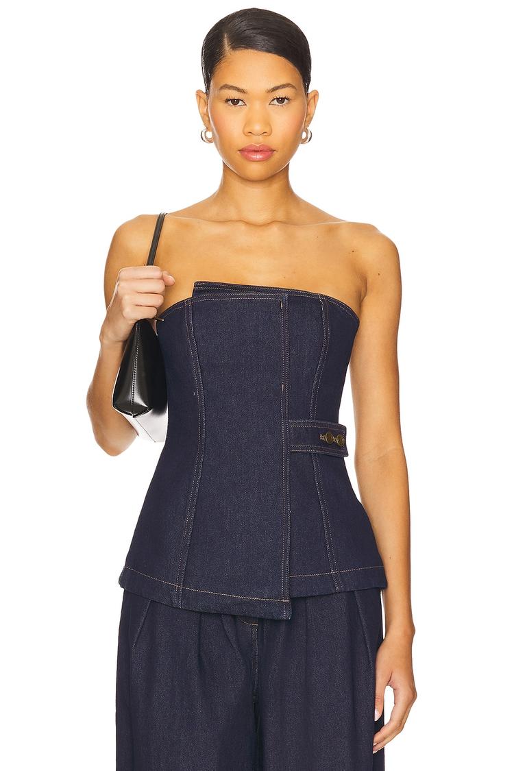 Rigid denim fabric shapes this fitted corset top with a sleek straight neckline and strapless sleeveless design, making a bold modern statement. The waist-length silhouette features a back zip closure for a secure fit and a belted buckle accent at the front side, adding chic detailing. Perfect for casual outings, brunch dates, or night out events, this matte dark blue corset blends structured style with versatile comfort, suitable for spring through autumn wear.