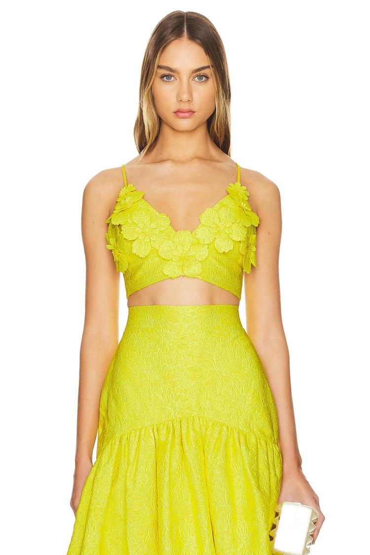 Bright yellow jacquard fabric and delicate applique floral details create a chic and modern vibe in this fitted camisole top. Featuring a sweetheart neckline and slender spaghetti straps, this cropped piece offers a flattering silhouette with its elastic back strap and back zipper closure for easy wear. Ideal for spring and summer, it pairs effortlessly for casual outings, brunch dates, or evening occasions, delivering a sexy yet sophisticated look.