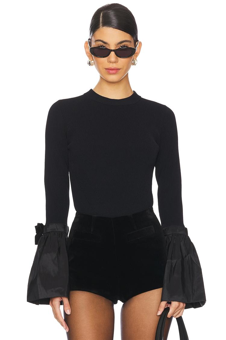 Elegant matte black shell top crafted from a soft ponte blend of rayon, elastane, polyester, and nylon offers a fitted silhouette with a classic crew neck. The standout feature is its dramatic long flounce sleeves finished with contrast poplin cuffs and velvet bow accents, adding a sophisticated, modern touch. Hip length and pullover style make it easy to wear for autumn and winter occasions alike. Ideal for casual outings, date nights, and girls' night gatherings, this chic top pairs effortlessly with tailored trousers or skirts for a refined yet stylish ensemble.