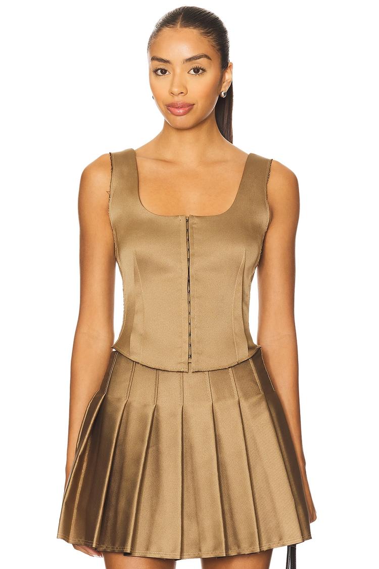Sleek and structured, this cropped corset top in matte tan polyester features a square neckline and wide straps, creating a modern silhouette that contours the body with a fitted design. The front hook and bar closure adds subtle detailing, while the lightweight coated twill fabric ensures comfortable wear. Pleated accents at the hem add texture and visual interest. Ideal for casual outings, brunch dates, or night out events, this chic piece transitions effortlessly across spring, summer, and autumn seasons.