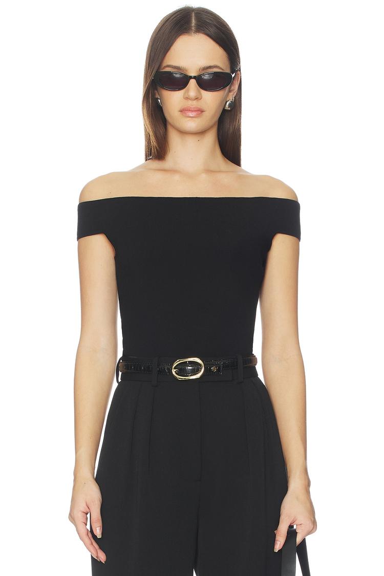 Effortlessly chic, this fitted black off-shoulder shell top features wide straps that frame the neckline beautifully. Crafted from a midweight jersey blend of rayon, nylon, polyester, and spandex, it offers stretch and comfort with a sleek matte finish. The waist-length silhouette is accentuated by a matching belt detail at the front, adding subtle sophistication. Ideal for casual outings, business casual settings, and date nights, this versatile piece blends minimalist elegance with classic charm for a polished, timeless look.