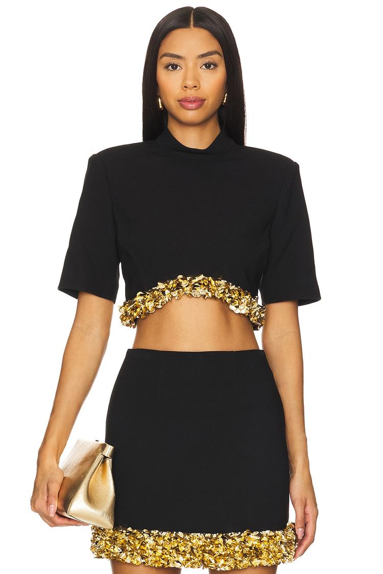 A sleek black cropped top with a sophisticated high neck and half sleeves offers a regular fit for comfort and style. The standout feature is the gold sequin embellishment along the hem, adding a touch of glamour. Finished with a hidden side zipper and a keyhole back closure, this elegant piece crafted from a polyester-acetate blend is perfect for cocktail parties, night outs, and date nights. Its versatile design merges chic minimalism with eye-catching details, making it a refined addition to any special occasion wardrobe.