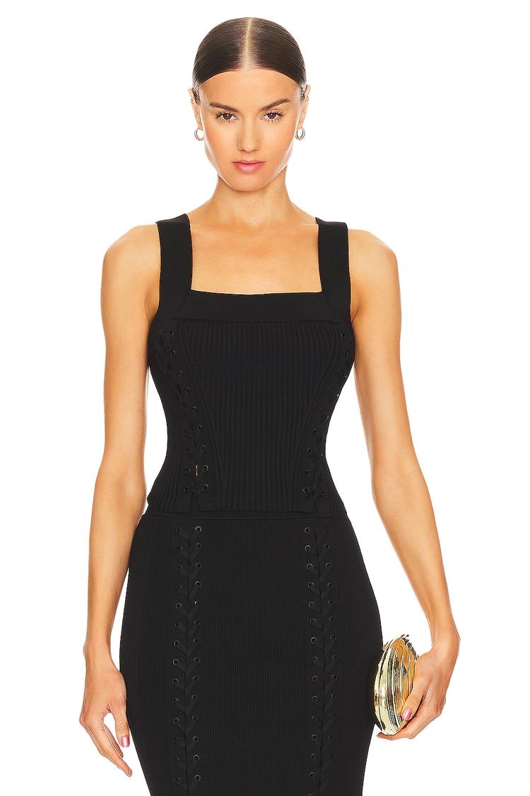 Sleek ribbed jersey fabric shapes this fitted tank top featuring a modern square neckline and wide straps for a flattering silhouette. The lace-up front detail adds a subtle edge to the matte black base, perfect for transitioning from casual brunches to date nights or lively evenings out. Comfortable yet chic, this waist-length piece blends minimalist style with a hint of sexy allure, ideal for spring through autumn wear.