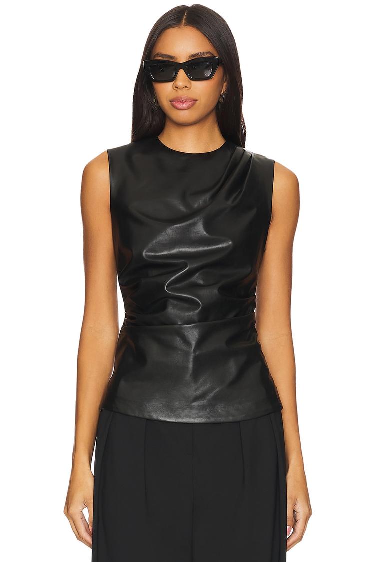 Sleek and modern, this fitted shell top features a crew neckline and sleeveless design crafted from matte black faux leather with elegant ruching all over. The concealed side zipper closure ensures a smooth silhouette while the hip-length cut offers versatile styling options. Perfect for layering in autumn and winter, this sophisticated piece transitions effortlessly from casual outings and business casual settings to chic night outs, offering a contemporary edge with its polished finish and streamlined fit.