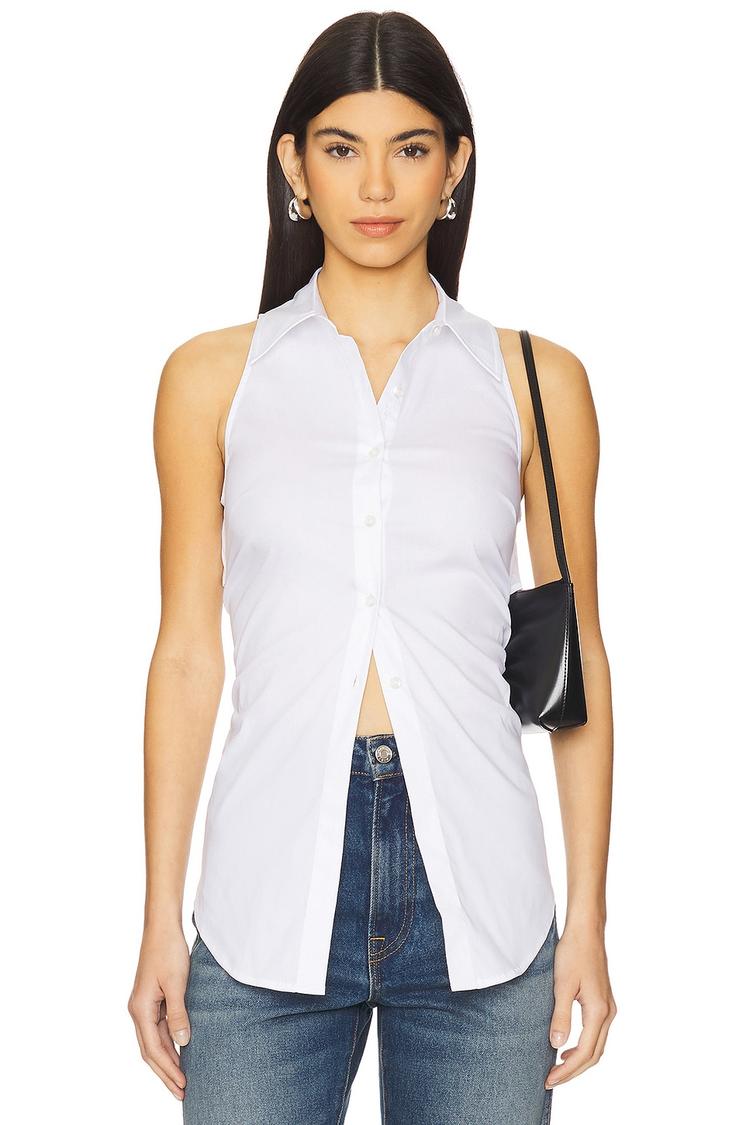 Crisp white poplin fabric and a slim fit define this sleeveless tank top, featuring a classic collared neckline and wide straps for a fresh, minimalist look. The hip-length hem and front button closures add structure, while the striking cut-out back with a tie-up detail lends a chic, contemporary edge. Versatile for casual days, brunch outings, or date nights, this top blends comfort with style, perfect for spring and summer wardrobes.