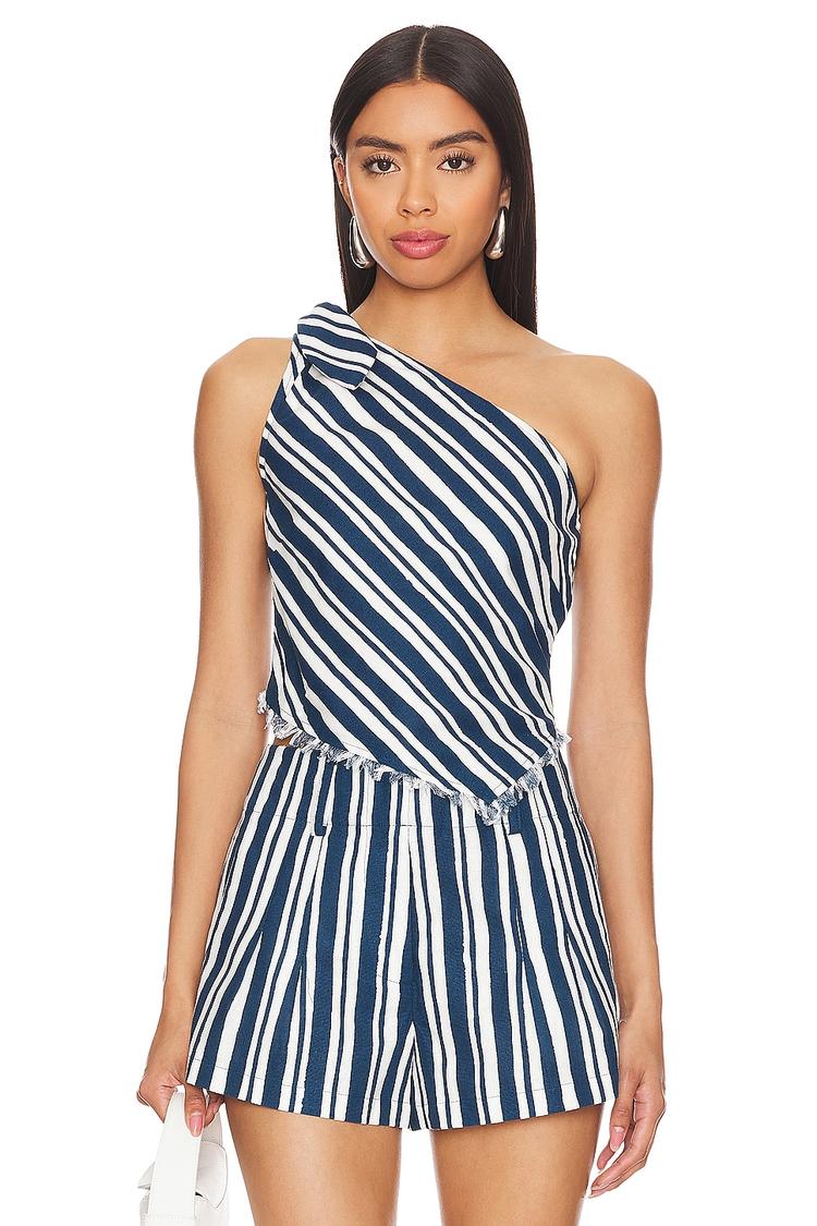 Effortlessly chic with an asymmetric neckline and wide strap featuring a delicate bow detail, this waist-length tank top is crafted from breathable linen-cotton blend. The navy and white all-over striped pattern adds a timeless appeal, while the frayed hem injects a subtle edge. Designed with a concealed side zipper for a clean silhouette, its regular fit suits casual days, brunches, or vacation escapes. Embrace minimalist modern style that blends comfort and sophistication for versatile spring and summer wear.