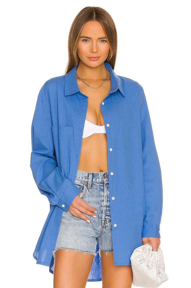 Feel instantly breezy in this Bello Button Up blue shacket, a lightweight, flowy layer crafted from a 65% cotton and 35% polyester blend. The relaxed silhouette falls to hip length with a classic turn-down collar and front button closure, finished with buttoned cuffs for a polished touch. Its curved hi-low hem drapes beautifully, making it effortlessly versatile: wear open over a bikini for beach vibes, or pair with denim shorts for a casual brunch. A true transitional essential that moves from day to night with ease—cool, comfortable and endlessly chic.