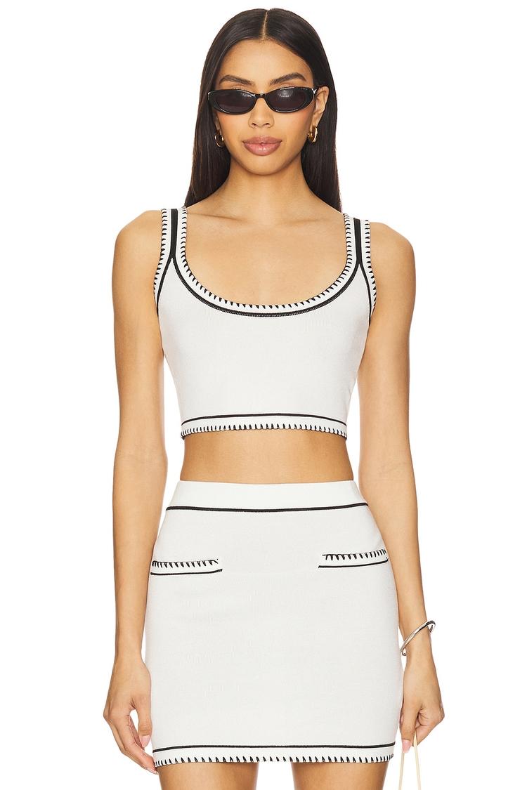 Crisp white polyester knit with contrast black embroidery trim creates a minimalist yet chic cropped top. The fitted silhouette and wide straps lead to a flattering U-neckline and sleeveless design, perfect for warm spring and summer days. Its cropped length pairs effortlessly with high-waisted bottoms, making it an ideal choice for casual outings, brunch dates, or everyday wear. The subtle embroidery border adds a refined detail, elevating the look while maintaining easy versatility.