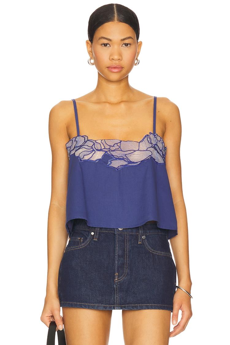 Soft cotton fabric and delicate embroidered details at the neckline define this chic camisole top. Featuring a loose fit with a cropped length and straight neckline, it is designed with slender spaghetti straps and a sheer bodice panel for added romantic flair. The covered back and pullover styling enhance its easy wearability. Ideal for warm spring and summer days, this versatile top suits casual outings, brunch dates, and relaxed evenings with friends, combining comfort with a feminine, stylish edge.