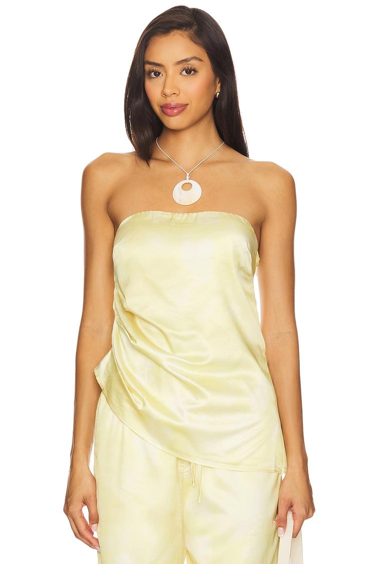 Softly shimmering in a light yellow satin fabric, this bandeau top features a sleek straight neckline and strapless sleeveless design that flatters with a slim fit. The hidden side zipper ensures a seamless silhouette, while delicate draping on the front adds subtle texture and elegance. Perfect for spring and summer outings, it pairs effortlessly for casual days, brunch dates, or stylish nights out, blending minimalist chic with modern appeal for versatile wardrobe styling.