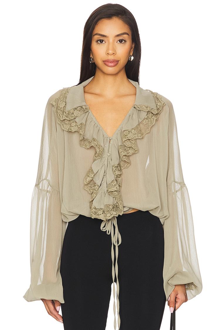 Lightweight chiffon and delicate ruffle detailing define this romantic cropped blouson top. The relaxed fit with long flounce sleeves and a V-neckline accented by lace trim creates an elegant, airy silhouette perfect for spring, summer, and autumn days. Featuring a front button loop closure and adjustable tie hem, this sheer piece lends itself well to casual brunches, date nights, and stylish everyday wear. Its soft matte beige tone adds a subtle sophistication to your wardrobe, making it a chic choice for layering or standalone styling.