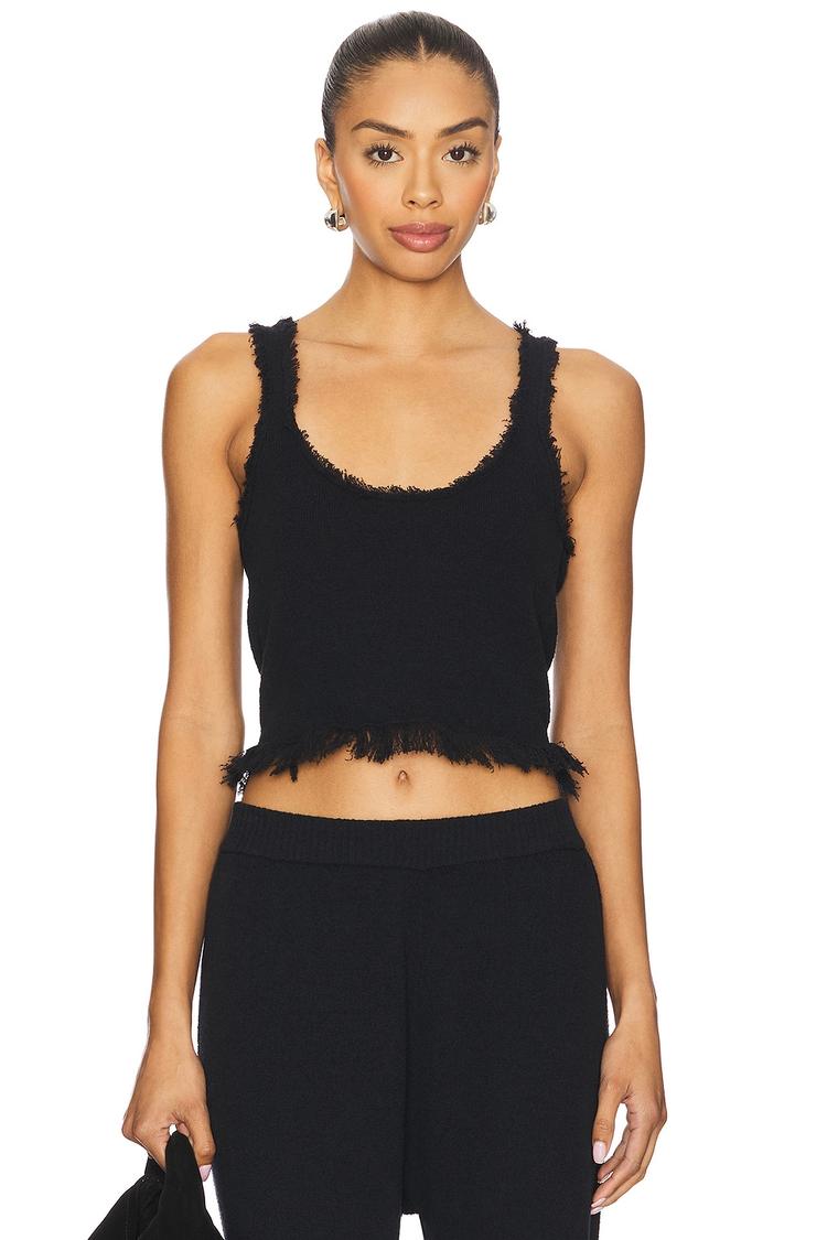 Midweight knit fabric and a cropped silhouette define this fitted tank top with a scoop neckline and wide straps. The matte black color is complemented by delicate fringe detailing along the hem, adding a subtle touch of texture. This minimalistic, casual chic piece is perfect for spring and summer days, ideal for casual outings, everyday wear, or brunch with friends. Its slip-on style ensures easy wear while maintaining a sleek and flattering fit.