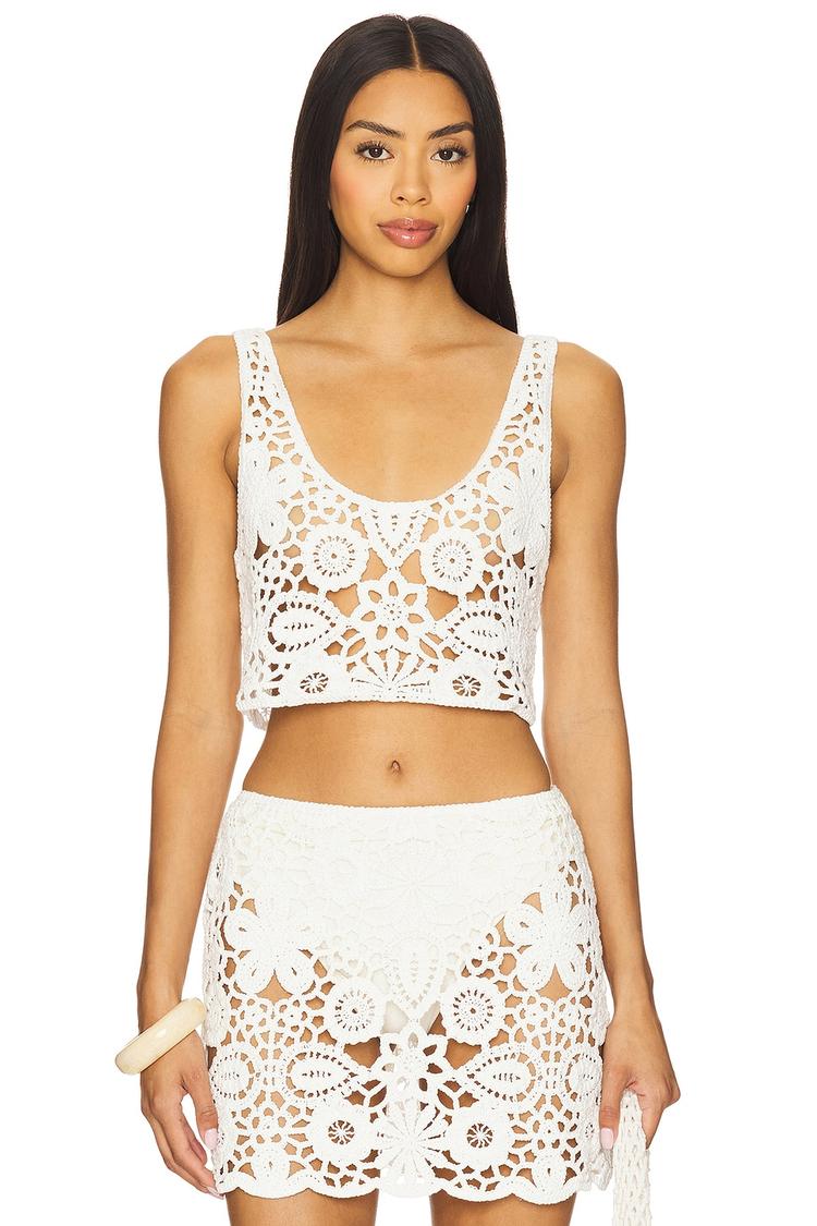 Delicate eyelet embroidery and a cropped silhouette define this slim-fitting white Tala Top, crafted from a midweight cotton-nylon blend with an intentionally sheer crochet design. Featuring a U-neckline and wide straps, this sleeveless pullover offers a breezy, bohemian vibe perfect for spring and summer days. Ideal for casual outings, beach vacations, or brunch dates, this top pairs effortlessly with high-waisted bottoms for a chic, relaxed look.