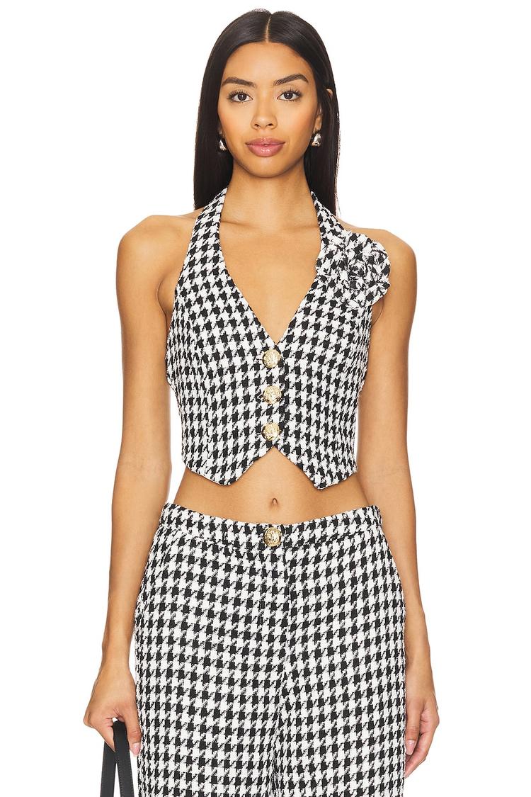 A chic cropped halter top crafted from midweight polyester tweed, featuring a classic black and white checkered pattern. The fitted silhouette complements the sleeveless, strapless halter neck design, accentuated by delicate rosette ruffle detailing on the shoulder. Gold-tone button closures add a touch of elegance and functionality. This versatile piece is perfect for casual outings, brunch dates, or a stylish night out, offering a trendy yet timeless look ideal for spring, summer, and autumn wardrobes.