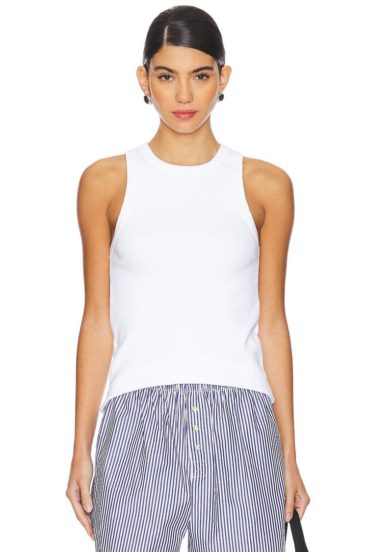 Heavyweight ribbed cotton jersey forms this clean, fitted tank with a classic crew neck and wide straps for comfortable, sleeveless wear. Its hip-length cut and minimalist solid white design make it a versatile piece perfect for casual days, travel, and everyday layering. The subtle stretch from elastane ensures a flattering fit, blending comfort and style effortlessly for spring and summer wardrobes.