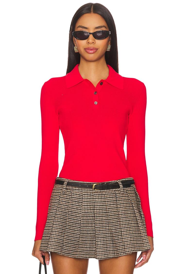 A vibrant red polo top crafted from a midweight knit jersey blend of viscose, nylon, and elastane offers a fitted silhouette perfect for layering or standalone wear. Featuring a classic polo collar with a partial front button closure and long regular sleeves, this waist-length top balances professional polish with casual comfort. Ideal for casual outings, workwear, and business casual settings during autumn, winter, or spring, it brings timeless style with a touch of modern minimalism to your wardrobe.