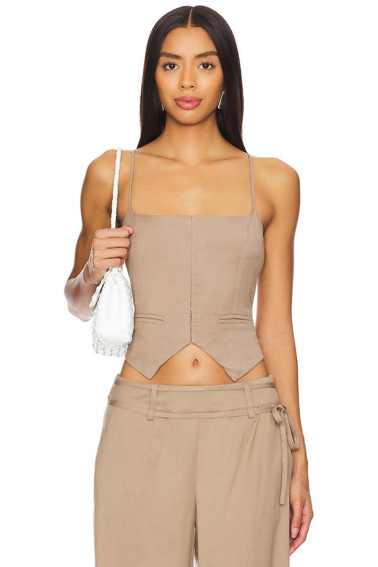Lightweight twill fabric and a sleek, fitted corset silhouette define this cropped top with adjustable spaghetti straps and a straight neckline. The hook and eye closure at the back ensures a secure fit while the matte beige hue offers versatile styling options. Ideal for spring and summer, this modern and trendy piece elevates casual looks and shines at brunch, date nights, or evening outings with its chic minimalism and flattering cut.