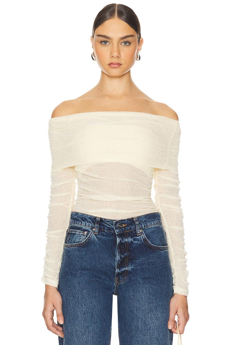 Soft mesh fabric with subtle ruching on the long sleeves defines this off-shoulder shell top in a delicate off-white hue. Its slim fit and waist length silhouette offer a flattering shape while the foldover neckline enhances its modern, sexy appeal. Perfect for casual outings, brunch dates, or an evening date night, this pullover piece blends comfort with chic style across spring, summer, and autumn seasons.