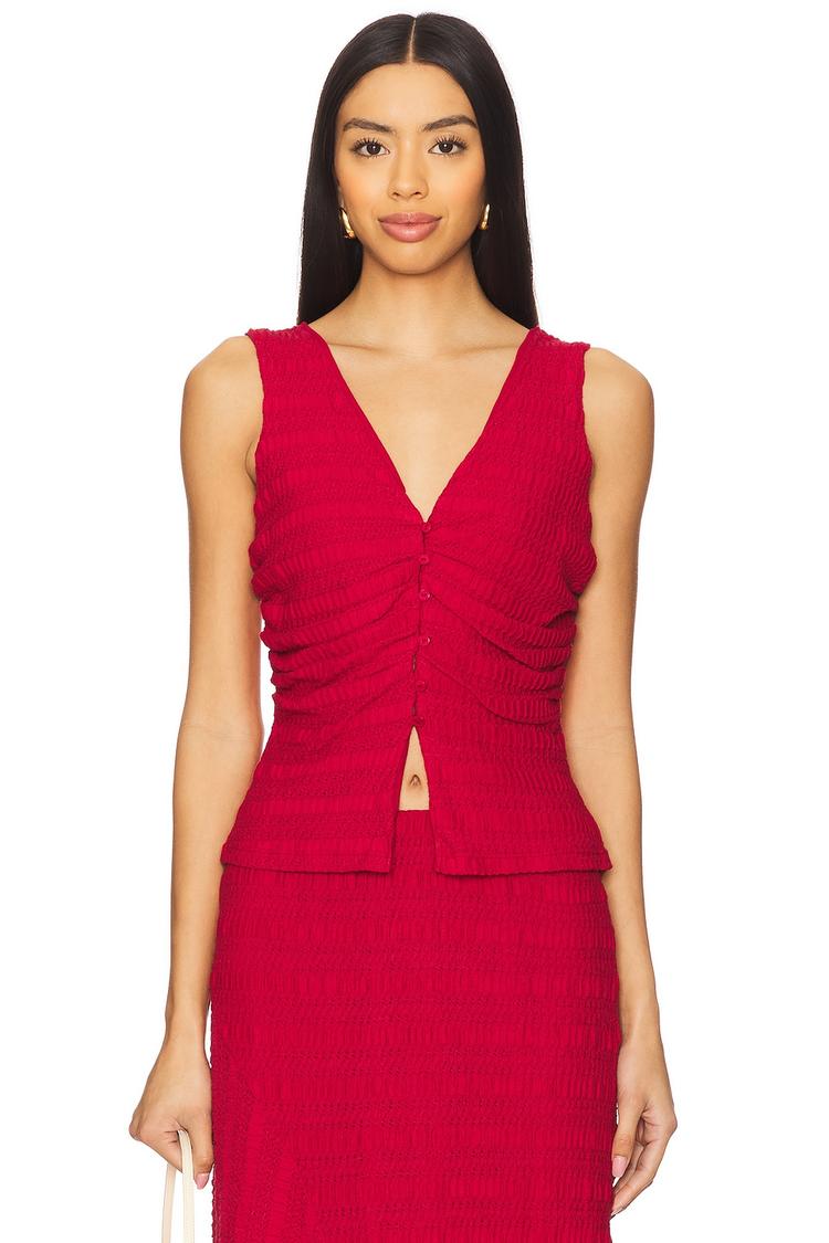 Ruching detail at the front and a sharp V-neck define this fitted shell top crafted from a midweight cotton-nylon-elastane jersey fabric. Its sleeveless design with wide straps and a waist length hem make it a versatile piece for spring through autumn. The front button loop closure adds subtle charm and ease of wear. Perfect for casual days, brunch dates, or stylish evenings, this modern and sophisticated top combines comfort with chic tailoring for effortless style.