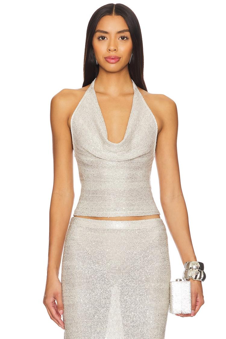 Shimmering sequin embellishments cover this fitted camisole crafted from a polyester-cotton blend, creating a semi-sheer, light beige silhouette that catches the light beautifully. Featuring a flattering cowl neckline and sleeveless, strapless styling with an open back, this cropped top is perfect for warm spring and summer nights. Its pull-on design ensures easy wear, while the side slit adds a subtle edge. Ideal for night outs, cocktail parties, and festive events, this chic piece elevates any party-ready wardrobe with its sparkling allure and sleek fit.