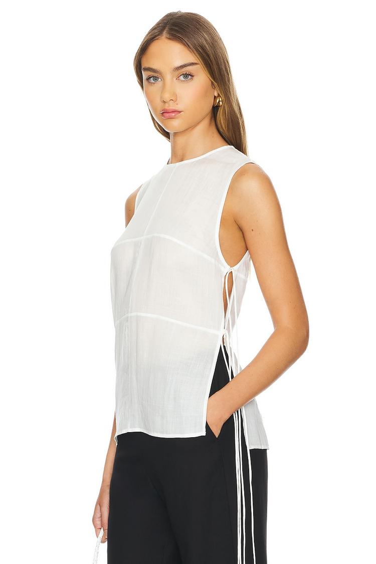 Lightweight linen and lyocell blend fabric creates a semi-sheer, breathable shell top with a clean round neckline and sleeveless design. This hip-length top features a regular fit and modern minimalist style, enhanced by side tie closures and a keyhole back with button closure for subtle visual interest. Ideal for spring and summer, it suits casual outings, brunch dates, and workwear settings with its elegant simplicity and airy feel.