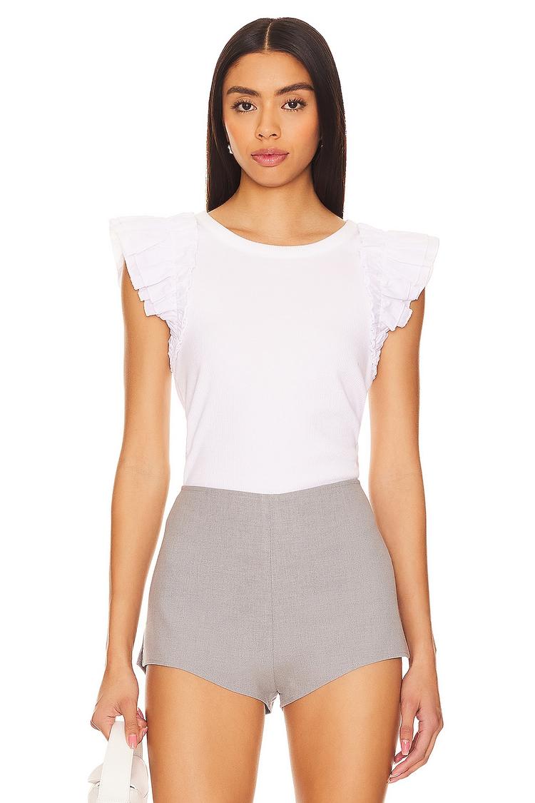 Soft jersey fabric and delicate ruffled sleeves define this shell top with a classic round neck and sleeveless silhouette. Its regular fit and hip length make it a versatile essential for casual chic styling. The pure white hue enhances its minimalist vibe, perfect for spring and summer days. Ideal for everyday wear, brunch dates, or casual outings, this top combines comfort and subtle feminine flair with its ruffle detailing on the sleeves. Crafted from a comfortable polyester-rayon blend with a touch of elastane and cotton contrast, it offers ease of movement and effortless style.