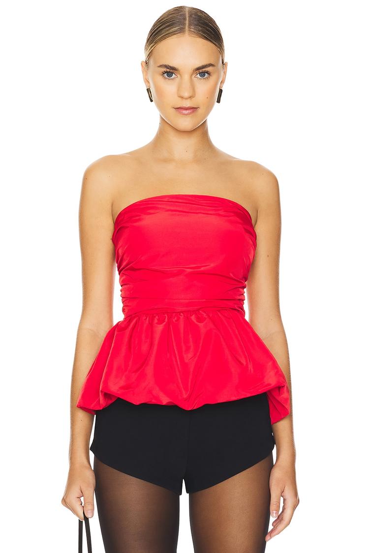 Bright red taffeta fabric shapes this chic bandeau top with a fitted silhouette that highlights the waist-length peplum style. The straight, strapless neckline pairs elegantly with smocked back detailing and a hidden side zipper closure for a sleek fit. Featuring a distinctive bubble hem that adds playful volume, this top is perfect for spring and summer outings. Whether you're dressing for brunch, a casual date night, or a night out, this trendy piece combines classic elements with modern flair for versatile wear.