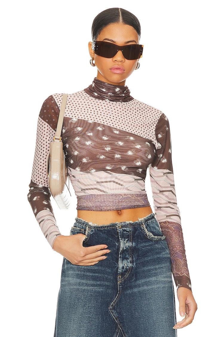 Ruched mesh fabric and a sleek mock neck define this slim fit shell top, crafted from a comfortable polyester-elastane-nylon blend. The all-over abstract and polka dot pattern in matte brown and cream adds a modern, trendy edge. Long regular sleeves and a waist-length hem create a flattering silhouette, perfect for layering or wearing solo. Its sheer panel accents bring a street style vibe ideal for casual outings, brunch dates, or stylish streetwear looks during autumn and winter seasons.