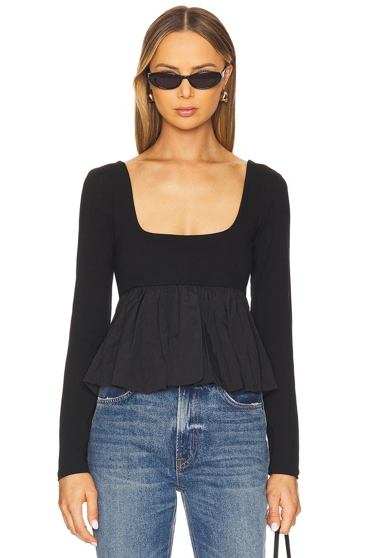 Fitted with a flared waistline, this Steve Madden peplum top in classic black offers a flattering silhouette for everyday wear. Crafted from a soft cotton blend with elastane for stretch and a nylon lining, it features a sleek square neckline and long regular sleeves. The concealed back zipper ensures a smooth finish while the waist-length hem adds a feminine touch. Ideal for casual outings, brunch dates, or relaxed everyday style, its timeless design and comfortable fabric make it a versatile wardrobe staple.