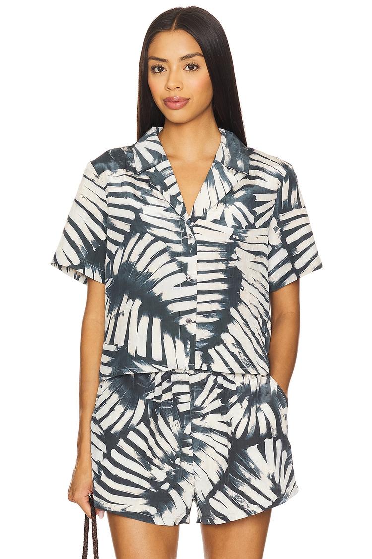 Effortlessly chic, this loose-fitting boxy top features a striking abstract print in matte dark blue and off-white hues. Crafted from a sateen blend of polyester and nylon, it offers a subtle sheen and smooth texture. The hip-length silhouette is complemented by half-length regular sleeves and a classic notch lapel collar. Front button closure adds to its casual charm, making it perfect for brunch outings, vacation days, or relaxed weekend wear. Its modern casual chic style ensures versatile wearability across spring and summer seasons.
