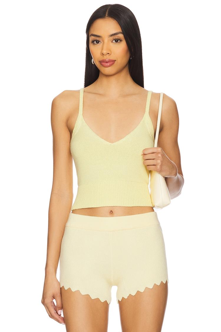 Soft cotton fabric and a fitted silhouette define this cropped tank top, featuring delicate spaghetti straps and a flattering U-neckline. Its midweight knit offers comfort and breathability, perfect for warmer seasons. The minimalist solid light yellow hue adds a fresh, casual chic vibe ideal for everyday wear, loungewear, or casual outings. Easy to pull on and style, this tank blends simplicity with subtle elegance, making it a versatile staple for spring and summer wardrobes.