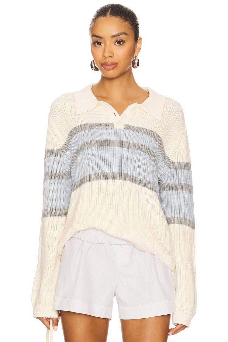 Soft, midweight cotton knit meets classic design in this relaxed-fit Stanford Polo. Featuring a timeless polo collar with partial front button closure, its hip-length silhouette is adorned with subtle horizontal stripes in light blue and gray over an off-white base. Long regular sleeves and a cozy knit texture make it perfect for layering during cooler spring, autumn, or winter days. Ideal for casual outings, everyday wear, or weekend brunches, this minimalist yet chic knit polo blends comfort with effortless style.