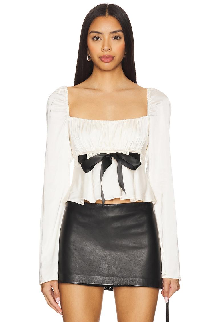 Soft matte off-white satin fabric and a fitted peplum silhouette define this long-sleeve top featuring a flattering square neckline and a waist-length hem. The romantic design is accentuated by a black belted ribbon bow at the front and back, adding an elegant touch to the chic style. Finished with a hidden side zipper and hook-and-eye closure, this versatile top is perfect for casual outings, brunch dates, or night outs where you want to exude understated sophistication.