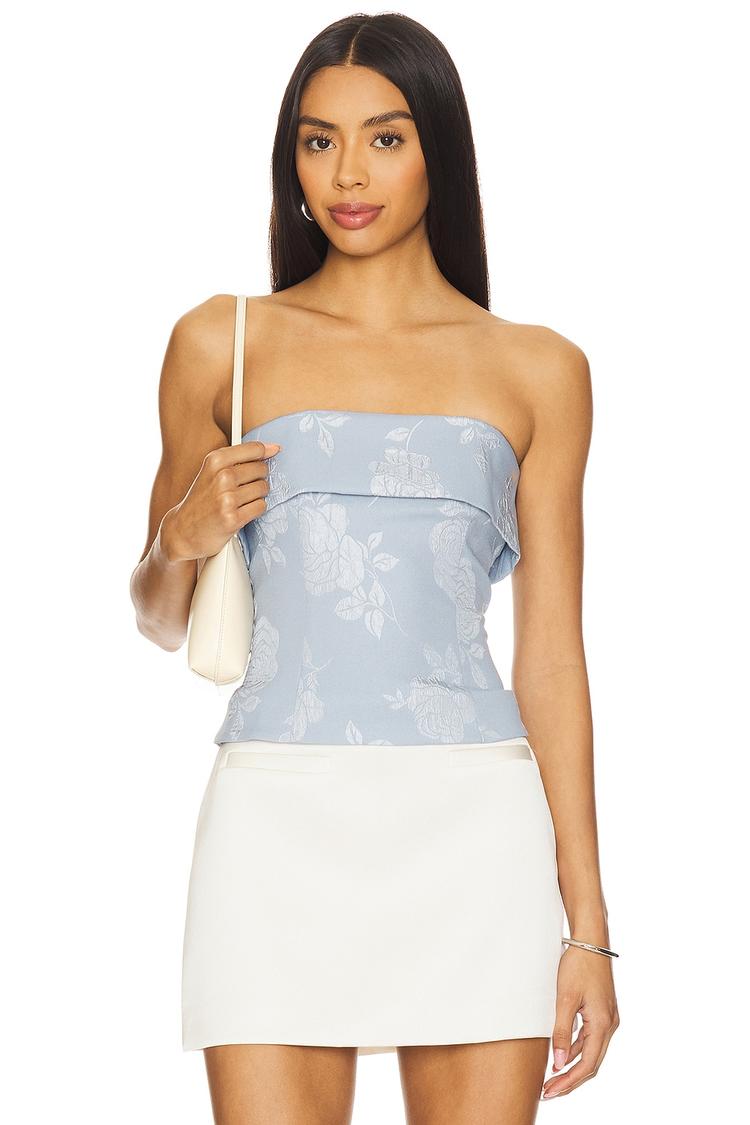 Soft jacquard fabric and a fitted boned bodice create a refined silhouette in this bandeau top featuring a straight, strapless neckline and concealed back zipper. The light blue base with delicate off-white floral patterns adds a romantic and sophisticated vibe, perfect for spring and summer occasions. Whether you're heading to brunch, a casual date night, or a stylish night out, this waist-length top offers versatile elegance with a chic, sleeveless appeal.