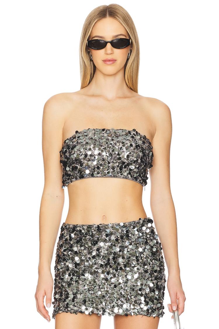Dazzle in this fitted, cropped tube top adorned with shimmering metallic silver sequins all over. Crafted from midweight polyester fabric with a hidden side zipper closure, it offers a sleek strapless neckline and sleeveless styling perfect for summer nights. This trendy and sexy piece elevates any night out, girls night, or party look with its sparkling texture and flattering silhouette, making it a standout choice for your festive wardrobe.